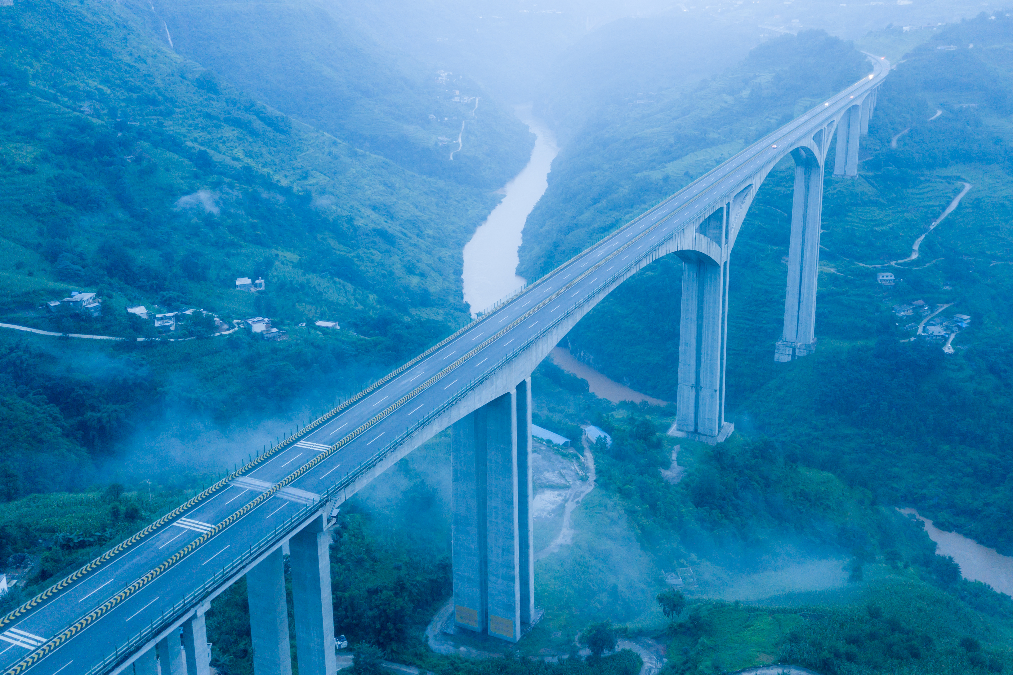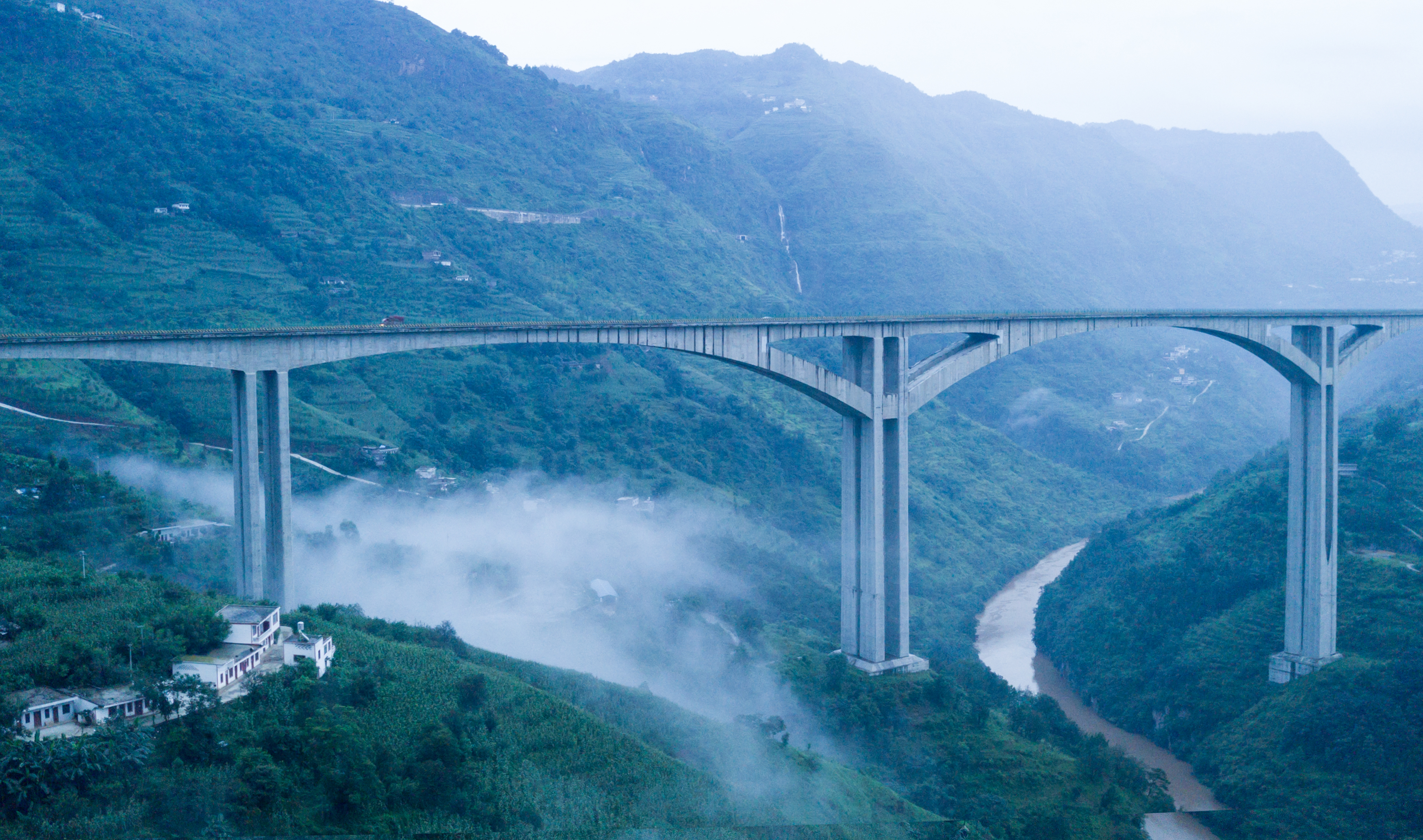 水盤高速公路北盤江特大橋全長1261m,主跨290m,是目前亞洲最大跨徑的預(yù)應(yīng)力混凝土連續(xù)(空腹式)斜腿剛構(gòu),被譽為“世界第一腿”。其空腹式結(jié)構(gòu)形式填補了跨徑在200~400m之間缺乏經(jīng)濟適用橋型的空白;研發(fā)了“下弦采用斜爬掛籃結(jié)合臨時扣掛系統(tǒng)懸澆,上弦采用支架結(jié)合移動模架滯后下弦節(jié)段現(xiàn)澆”部級施工方法,并研制了大傾角、變曲率、可斜向行走的上置斜爬式掛籃國家發(fā)明專利。大橋于2013年8月16日建成通車。